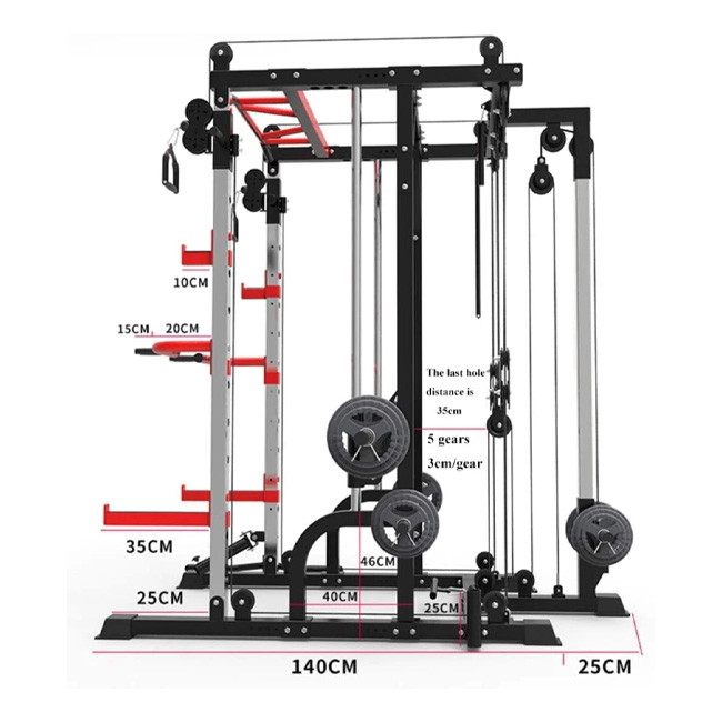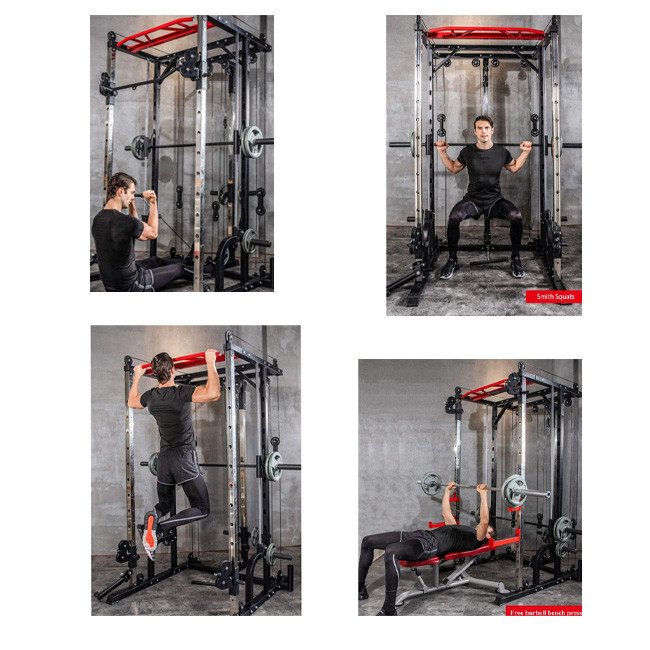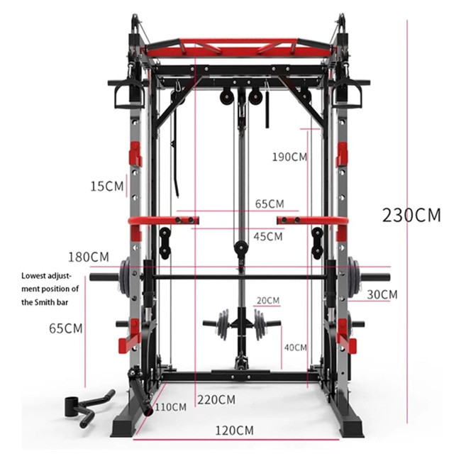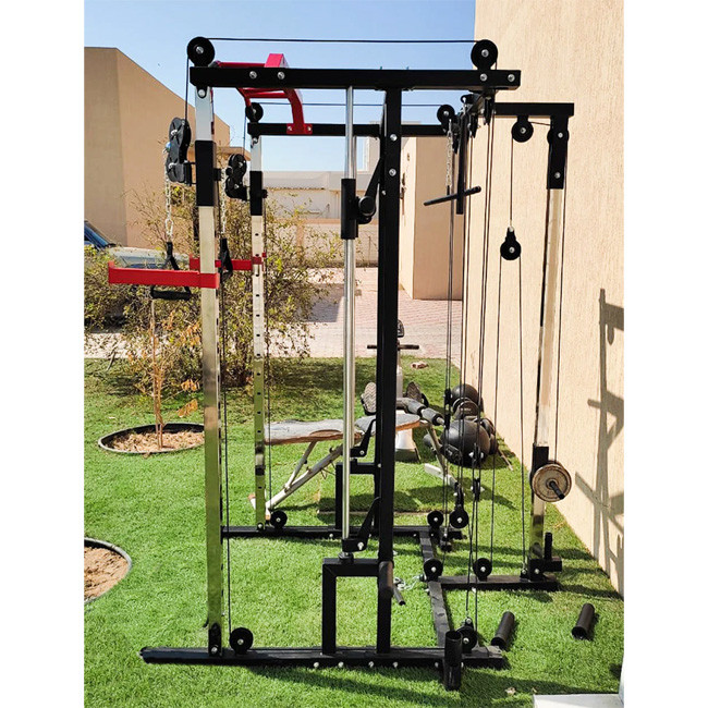 1441 Fitness Functional Smith Machine is the ultimate all in one trainer. It has combined a functional trainer with a counter-balanced commercial smith barbell added a squat rack with spotter arms and designed a clever pulley system all in one compact amazing machine.