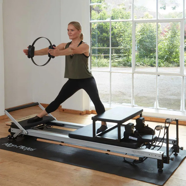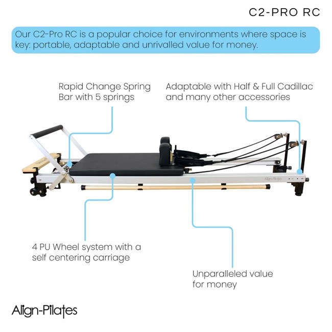 The C2-Pro RC's compact design and ease of stacking or freestanding use make it a portable device. Leg Extensions or the optional Freestanding Legs can be used to raise the bed height from the 24 cm of the standard machine to 42 cm. Because of its adaptability, it's a great choice for a multipurpose area that can change to meet your changing needs. With the C2-Pro RC's capacity to accommodate a Full or Half Cadillac frame and an assortment of accessories, your exercise options will be even more expanded.