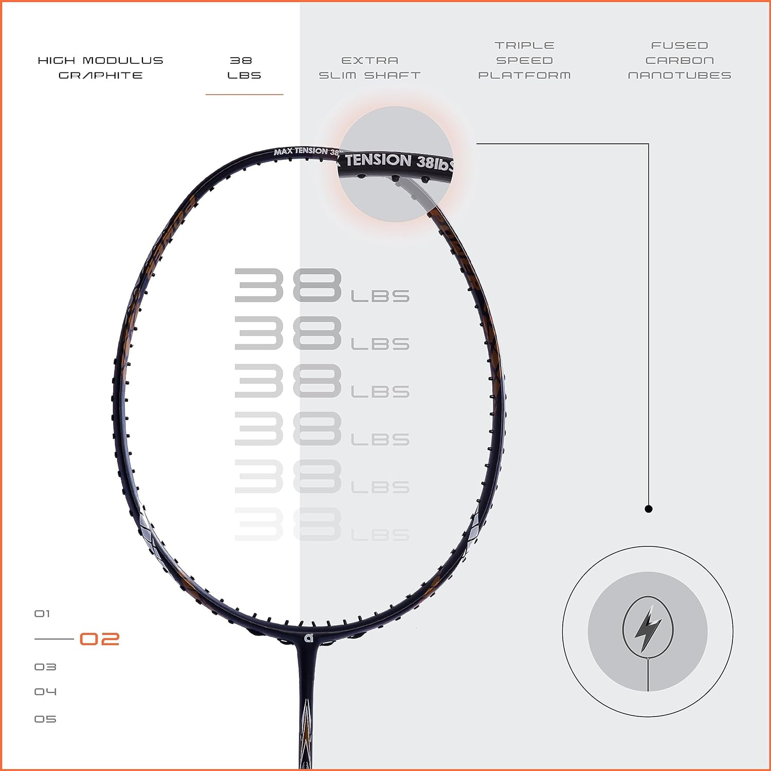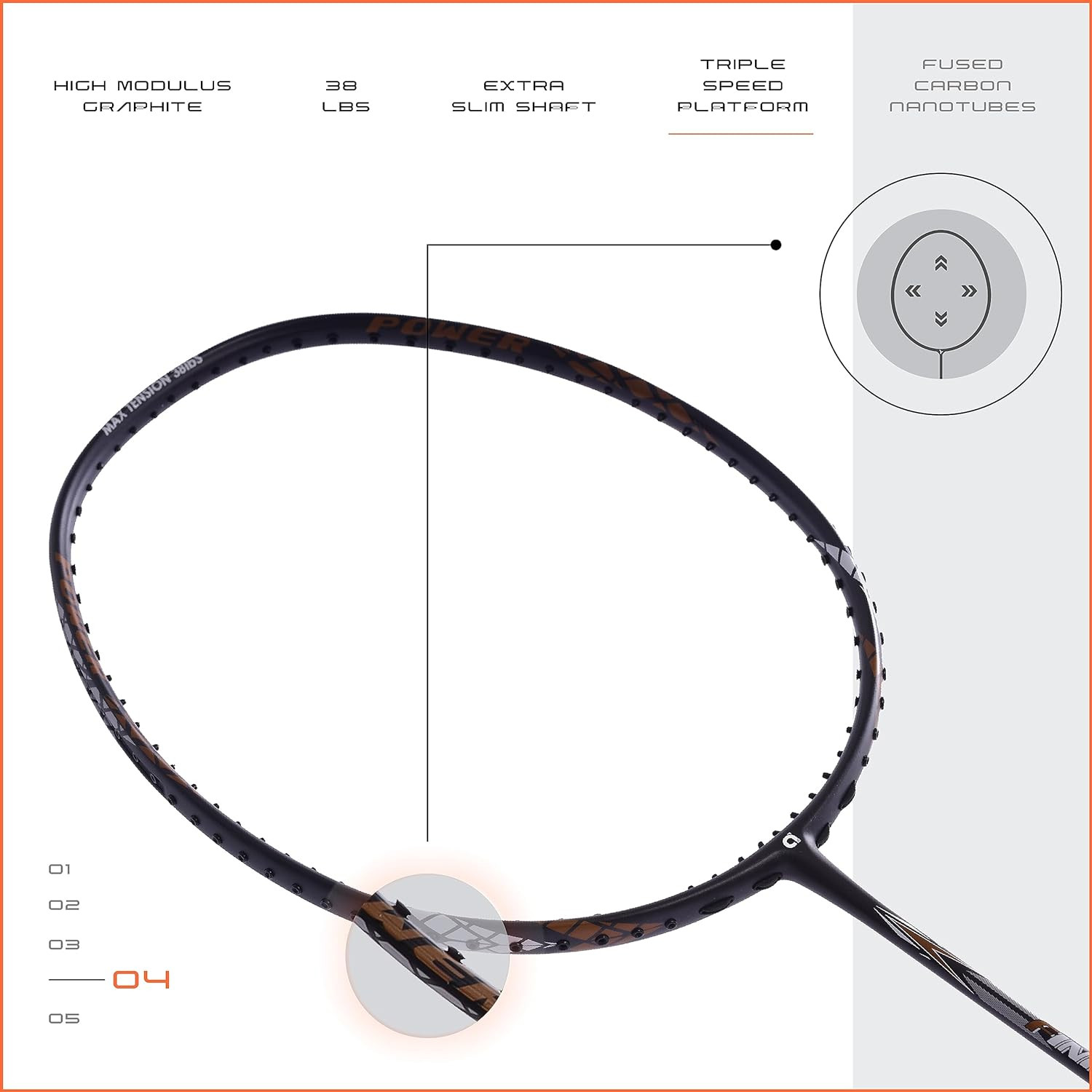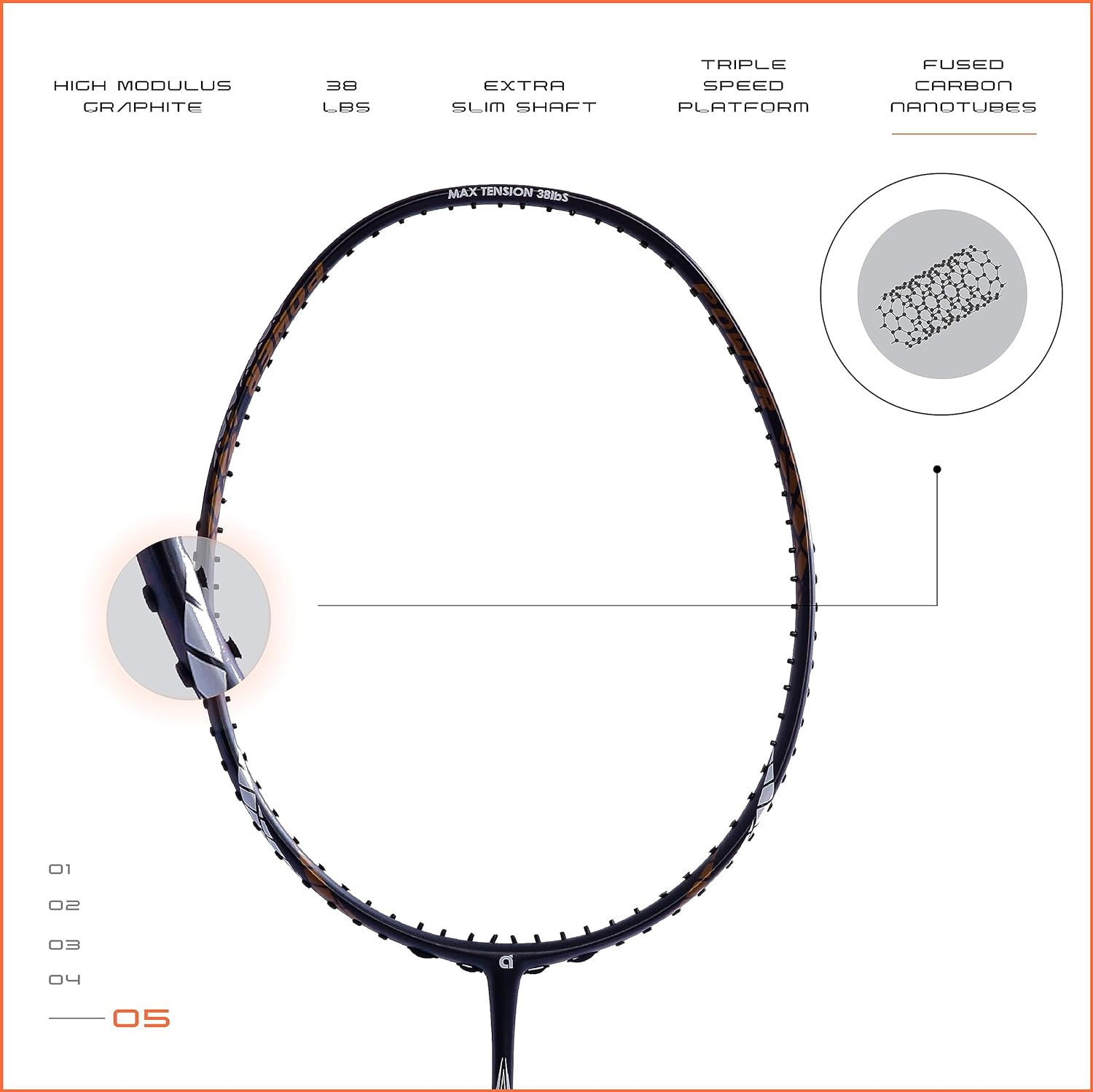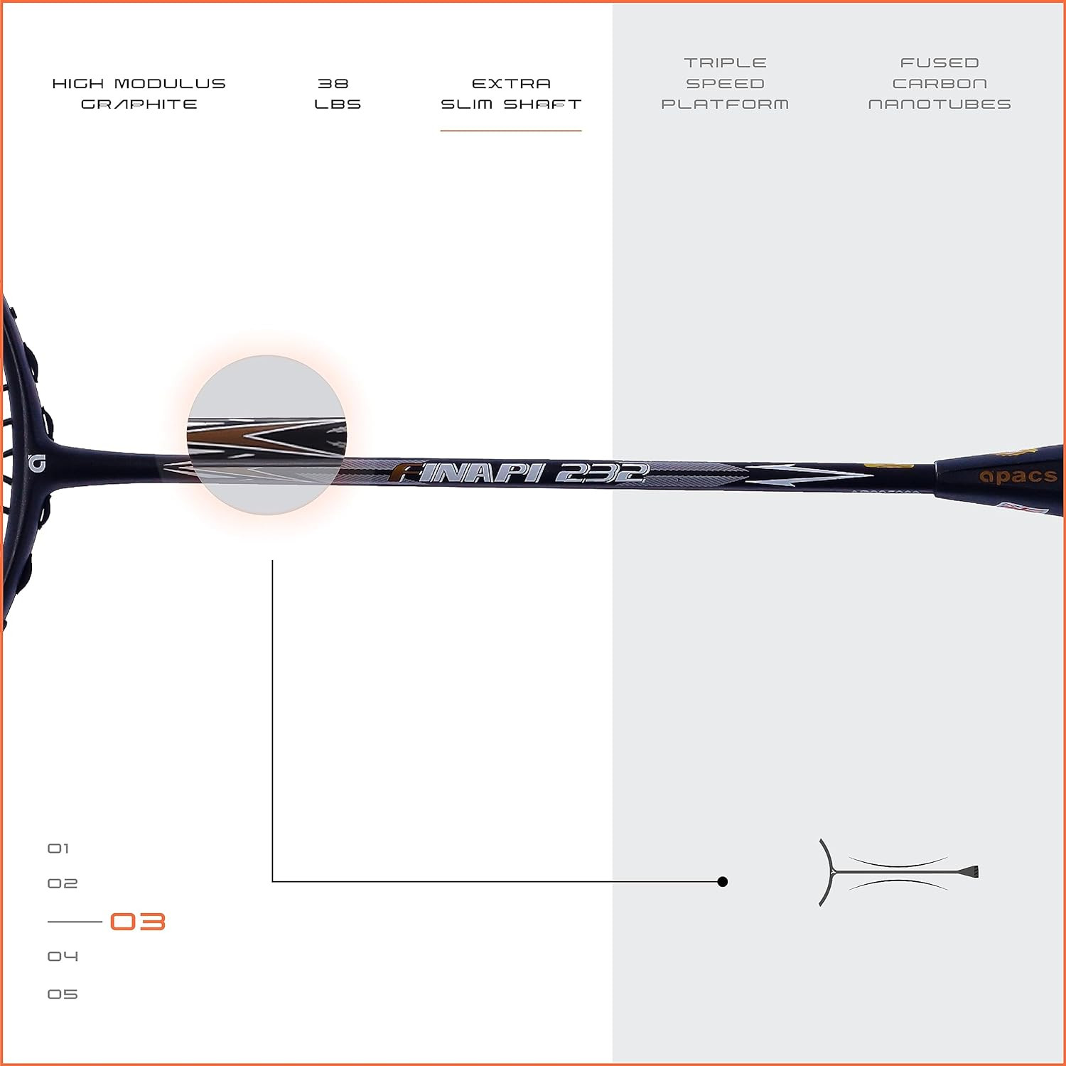 Finapi 232, a legendary racket known for it high tension capacity upto 38 LBS (Highest in the industry) and extreme durability from Apacs. Finapi 232 is developed with Carbon Nanotube material which increases the impact and bending strength of frame and shaft. Further, the base graphite material of racket is 24T Japan high grade graphite material. This badminton racket is developed with new concept known as Triple Speed System Frame which gives additional power and strength to racket frame helps in better playing characteristics.