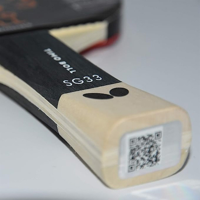 Table tennis bat Butterfly Timo Boll SG33 for leisure players and club players. With Addoy rubber and 1.7 mm sponge. Balanced spin and speed rating. Innovative smart.grip handle technology for simple handle gripping and improved contact to the hand palm. Concave handle. With stickfix.