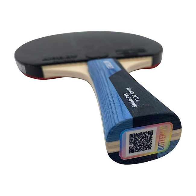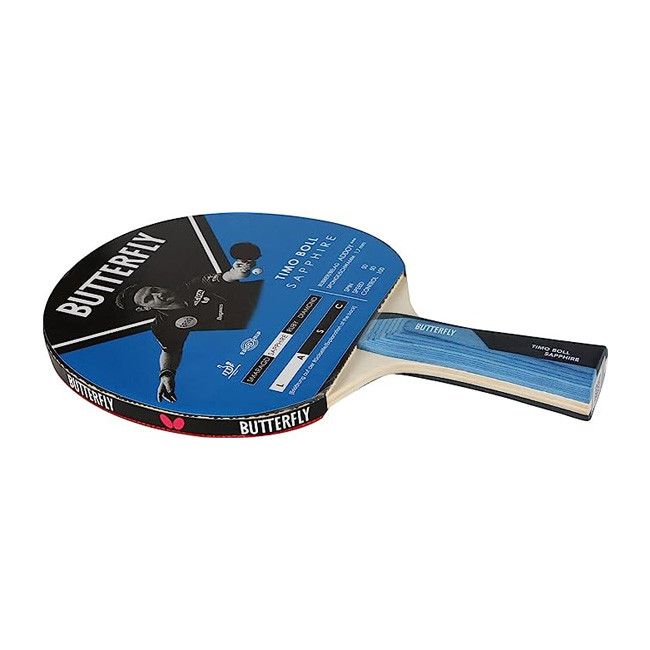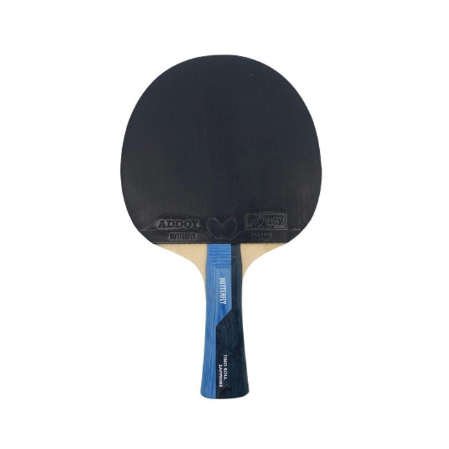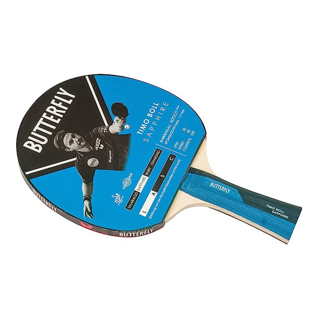 High quality leisure bat Butterfly TIMO BOLL SAPHIRE for first club experiences. The Addoy rubber with 1.7 mm sponge and Ergo Grip provides adequate control and speed. Anatomic handle. With stickfix.