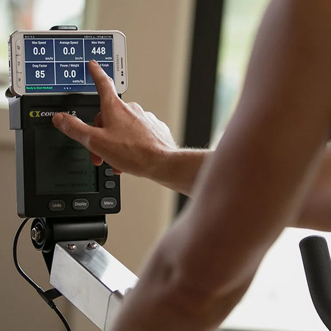 Several apps can be connected to the PM5 Monitor via Bluetooth, including ErgData and third-party apps like Zwift. Small smartphones and large tablets of all sizes can be held in the device holder, which is quickly and simply adjustable. The Performance Monitor can be placed at the end of the handlebar rail by removing the device holder.