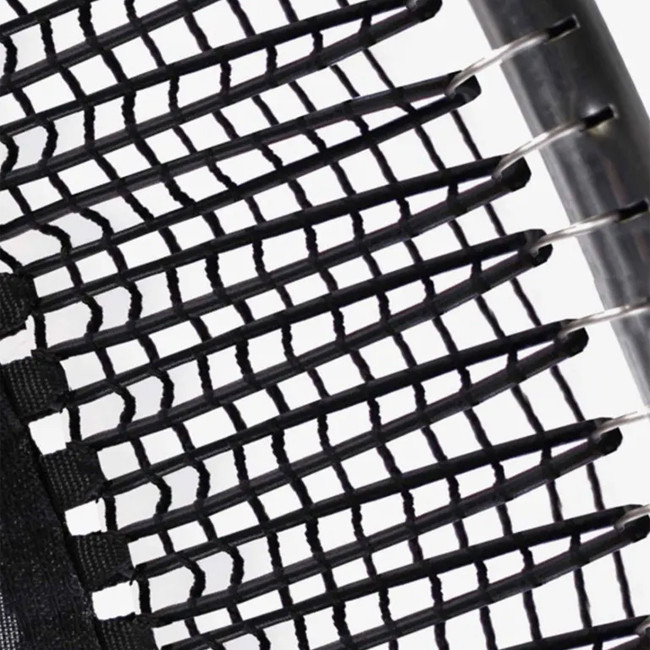 A dense elastic mesh of numerous elastic microfilaments ensures propulsion on the Springcare trampoline. The dynamic rebound, similar to that of a spring trampoline, has the advantage of being easier on the joints and giving the feet special flexibility. Additionally, unlike metal springs, it is obviously not unpleasant to revert to using the elastics.