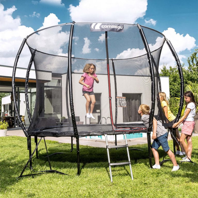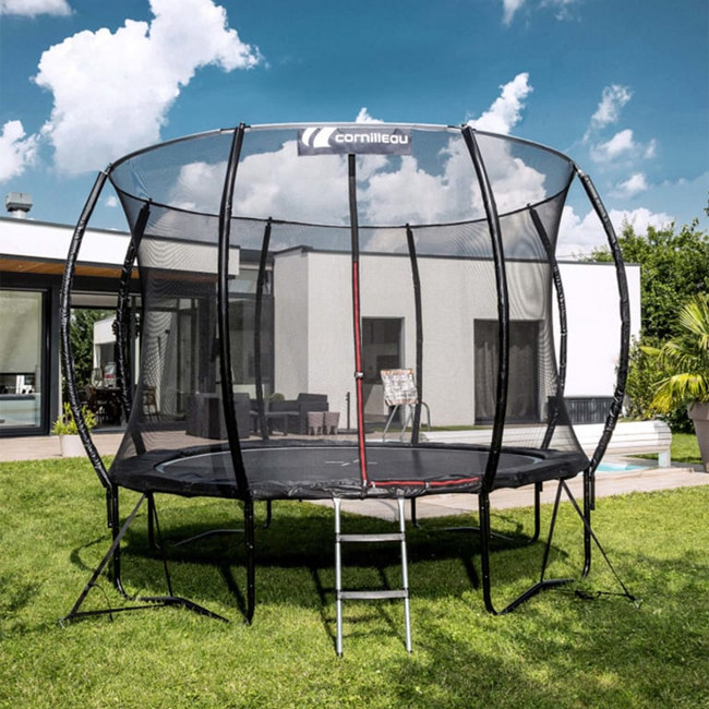 The Springcare 10 Feet trampoline propulsion system is distinctive and patented. A dense elastic mesh made of numerous tiny filaments is used in place of traditional springs. This invention has many advantages in terms of comfort and safety because the rebound eases joint stress. In the Cornilleau laboratories, each part of the Springcare trampoline has undergone rigorous testing to guarantee its sturdiness and that it will continue to function well even after being used thousands of times.