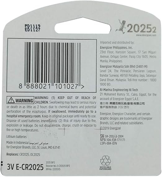 • Energizer Coin CR2025 3V Lithium Battery (Pack of 2)