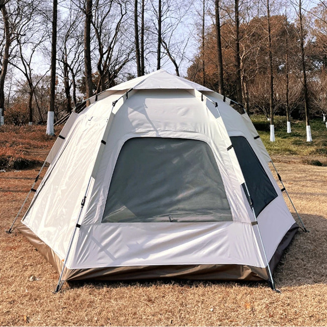 Place the folded tent on level ground, remove the carry bag, unfold the unit, and release the locking catches. Pull out the guy ropes and pegs, tension the lines and stake the corners. Finally, confirm vents and door zippers operate smoothly. The tent’s quick-open mechanism removes the need to thread poles manually.