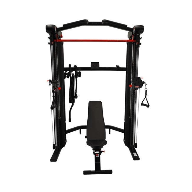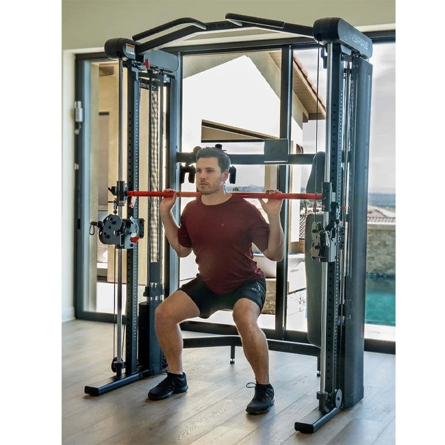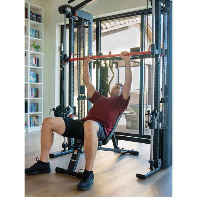 The Inspire Fitness SF3 Smith Functional Trainer is a one-of-a-kind device that combines a full-functional trainer with a plate-free smith machine to give users the best of both worlds. In order to create a safer, more practical, and more portable smith machine, our distinctive red smith bar ties directly into the weight stacks. It is made with patented engineering that is unique to it.