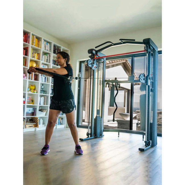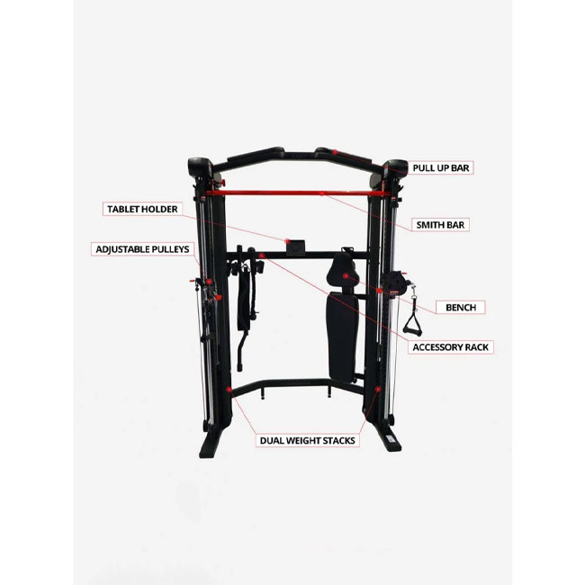 The SF3's two 165 lb weight stacks and 39 pulley positions give users complete freedom of movement while exercising. The SF3 brings the entire gym to you. It includes a tablet holder, two weight stacks, two sliding pulleys, a selectorized smith bar, a pull-up bar, an adjustable folding bench, and a full accessory set.