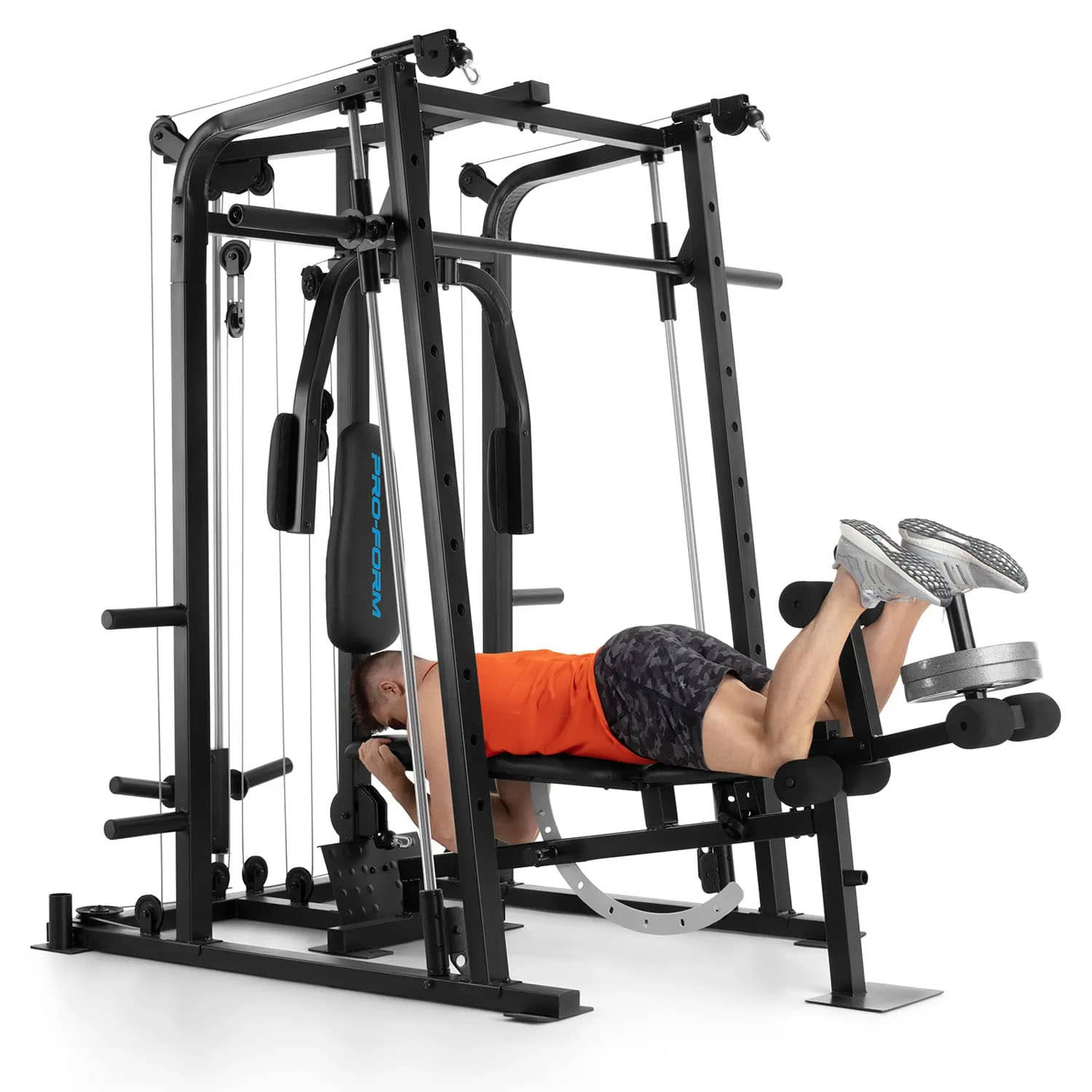 Develop full-body strength in the comfort of your home with the ProForm Sport Pro 8500 Smith Cage. Featuring a comprehensive array of workout stations, the Sport Pro 8500 Smith Cage can be used to supplement or replace your annually-renewed gym membership. Train your quads, hip flexors, and hamstrings with an integrated leg developer and isolate your biceps for an incredible workout that burns calories and sculpts muscle with a preacher curl pad. Engineered to offer a safe alternative to free weight training for solo weightlifters, an integrated smith barbell features progressive bar holds that can be easily engaged if a lift becomes too difficult.