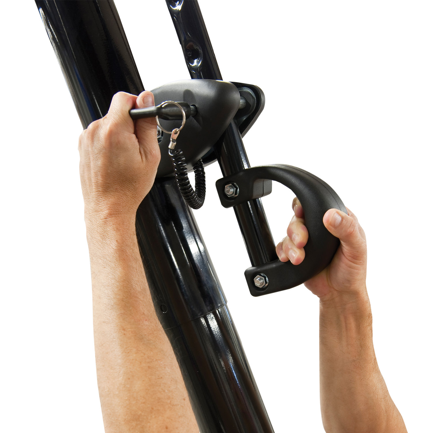 Use the telescopic lift system to set your desired height between 7.5 ft and 10 ft. Lock it in place.