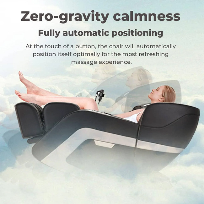 Space Saving with Zero Gravity Positions. With Zero Gravity position providing a total relaxed position wherein the feet are elevated, maintaining bodily functions at an optimal level. Auto extendable footrest with 3 rows of underfoot rollers allowing more intensive and more in-depth massage.