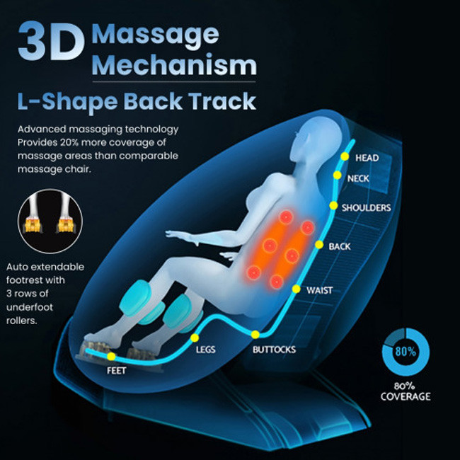 3D back massage mechanism and L-shape backtrack. L-track system is a shape of roller trail designed to supports your neck to back and all the way to buttocks and this position decompresses each individual spine of your body and increases the effects of massage.