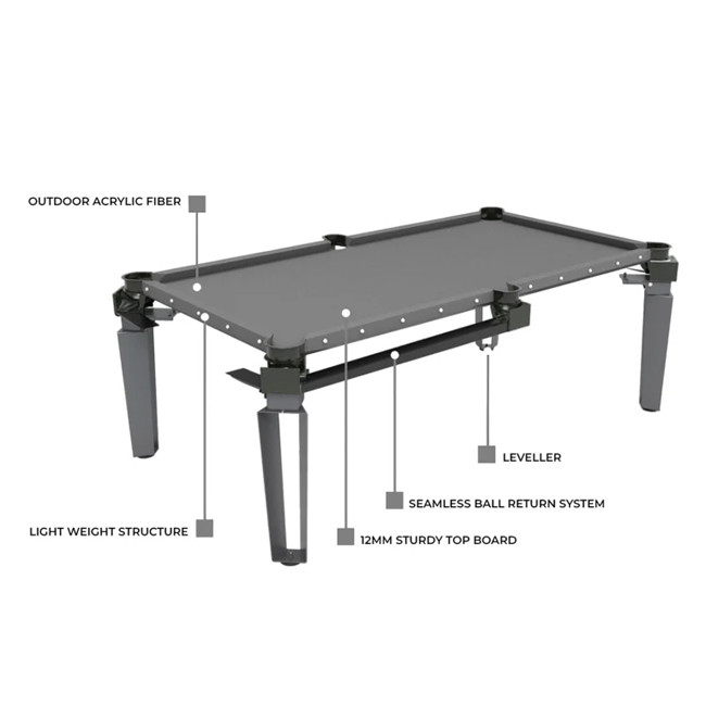 An 8mm aluminum honeycomb structure is placed on top of a 4mm melamine board to produce a level, strong, and stable playing surface. The stacked layers are protected by a weatherproof acrylic fabric that can be used year-round both inside and outside.