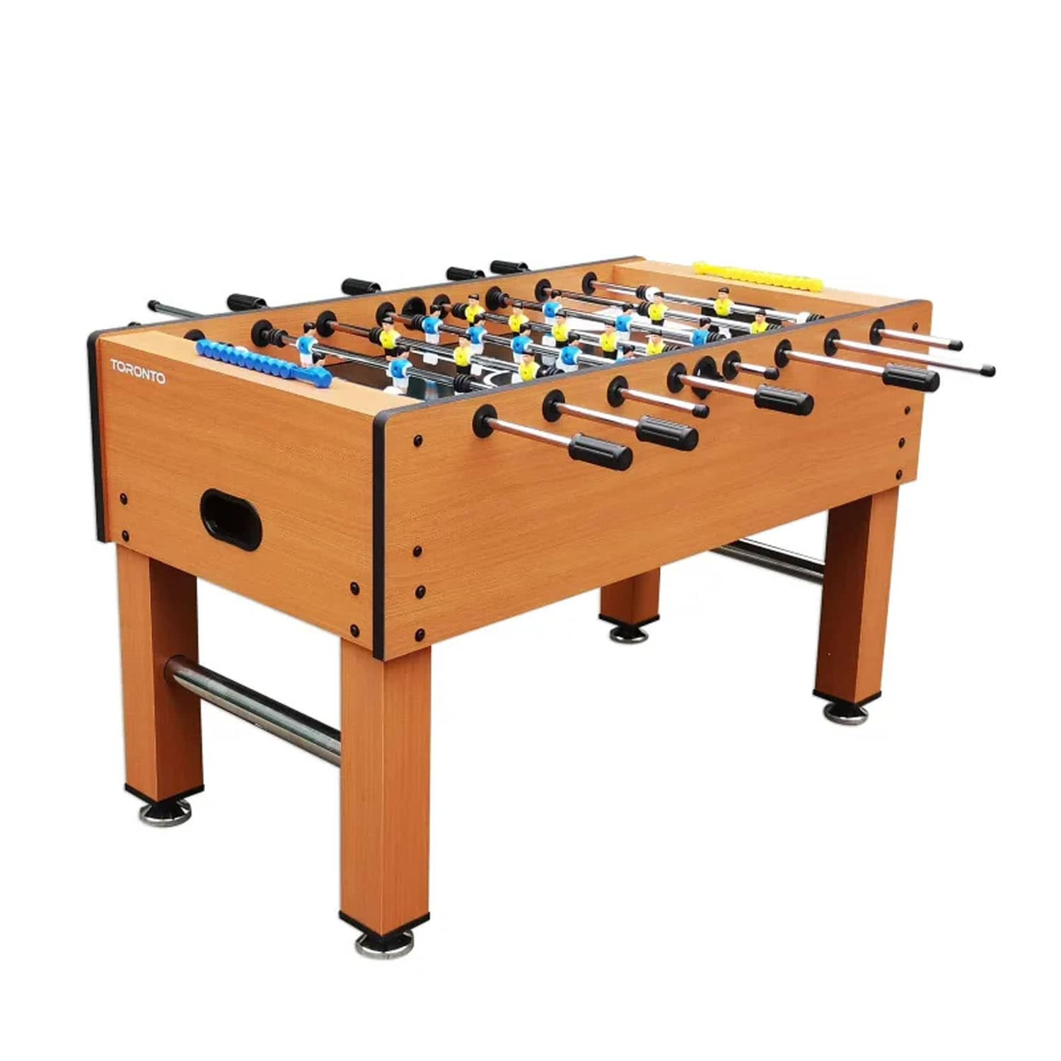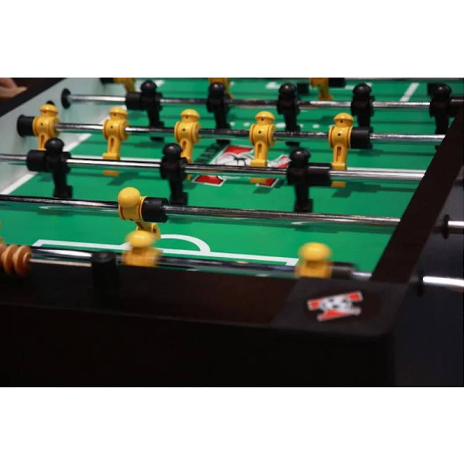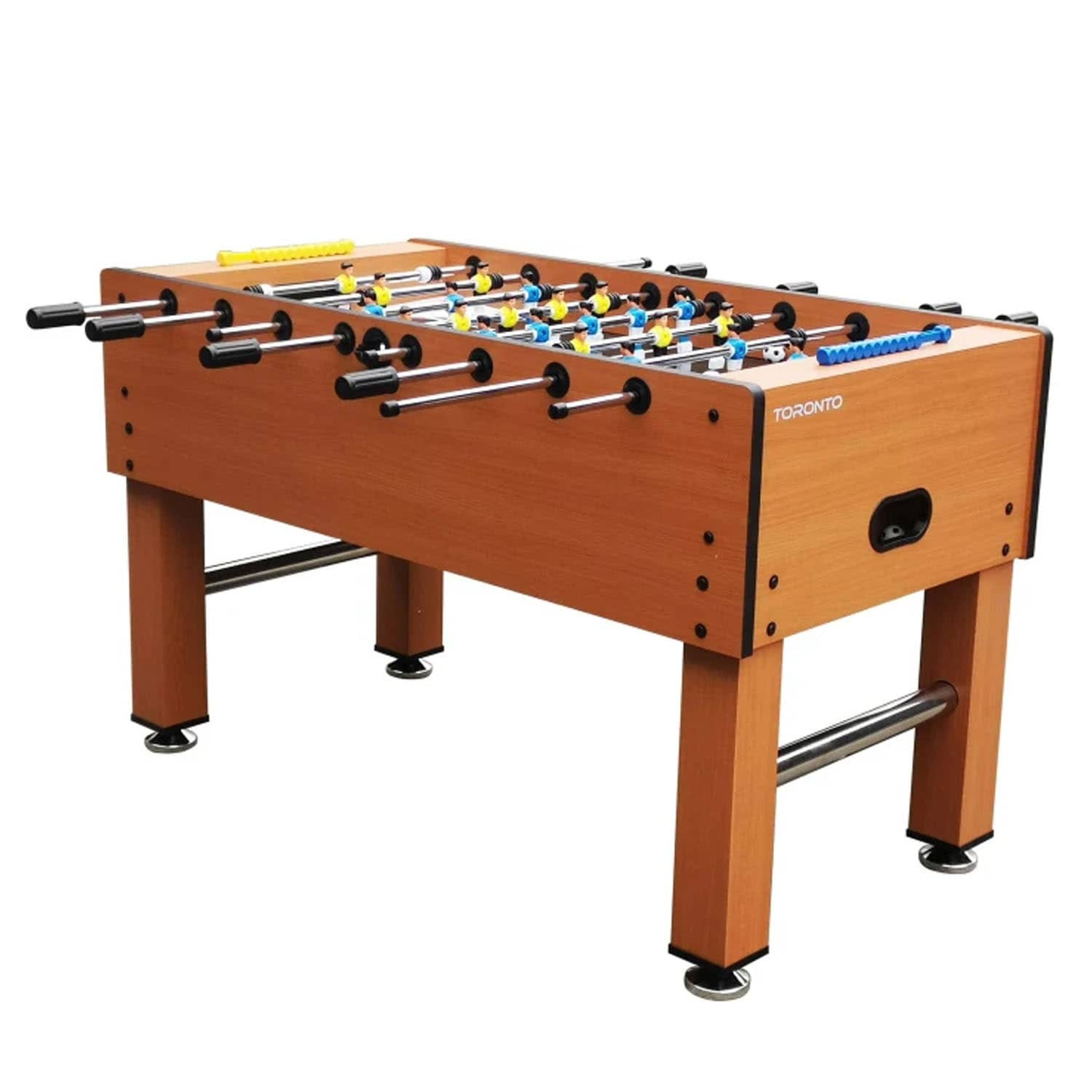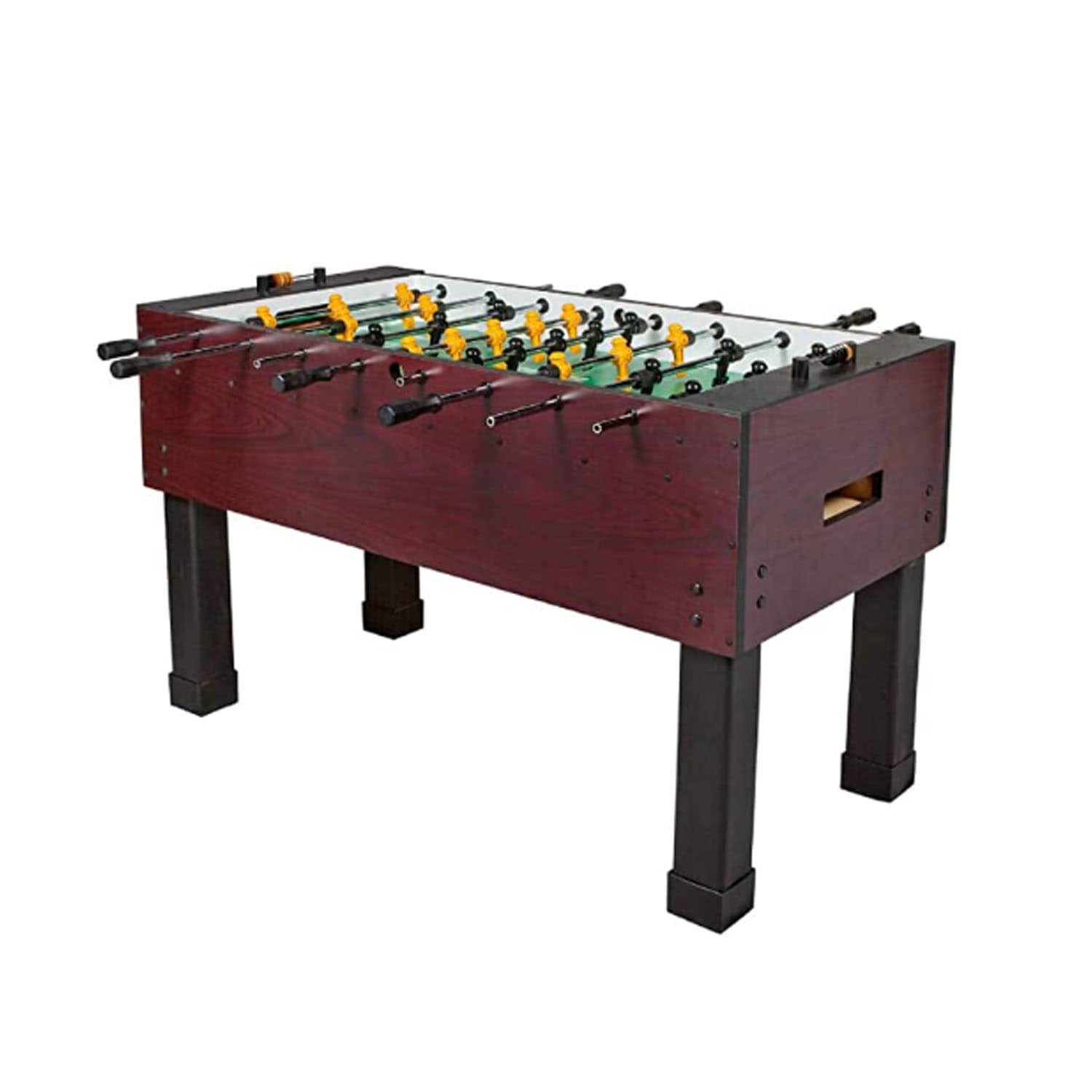 This 4FT indoor football soccer table is MDF wooden with color sticker pattern, strong steel rods with slide bearings for smooth rotation and ball serve cups on both sides for convenience.