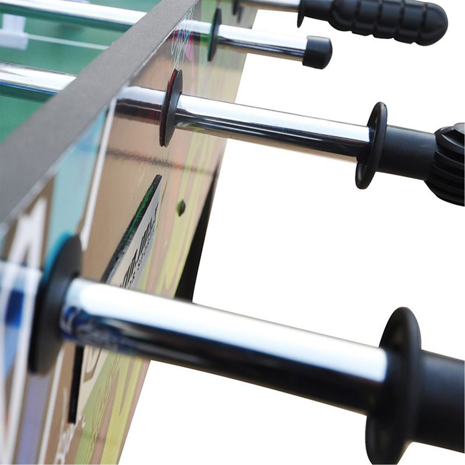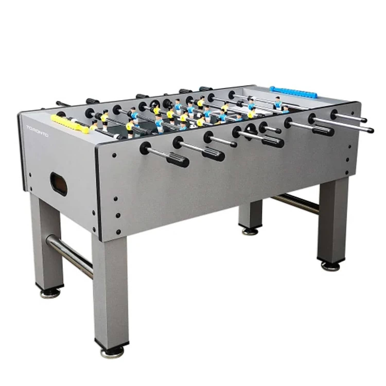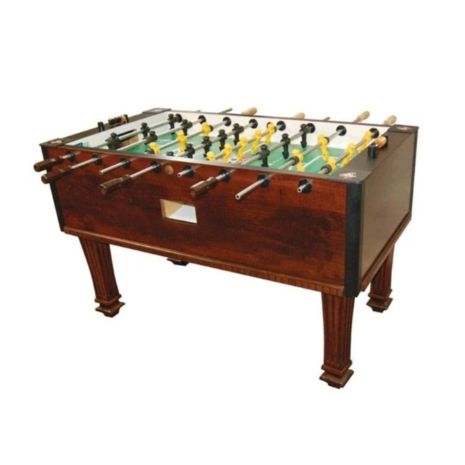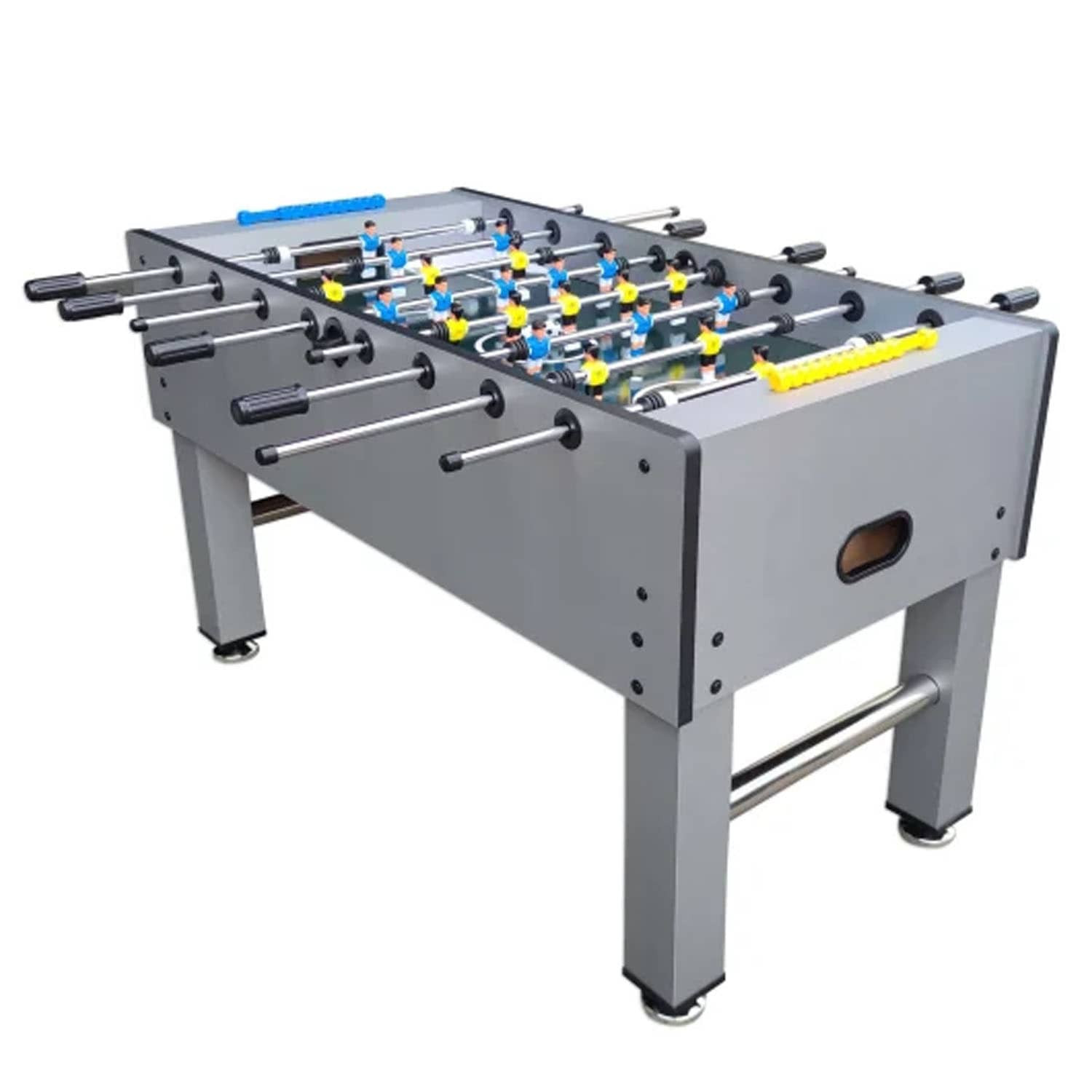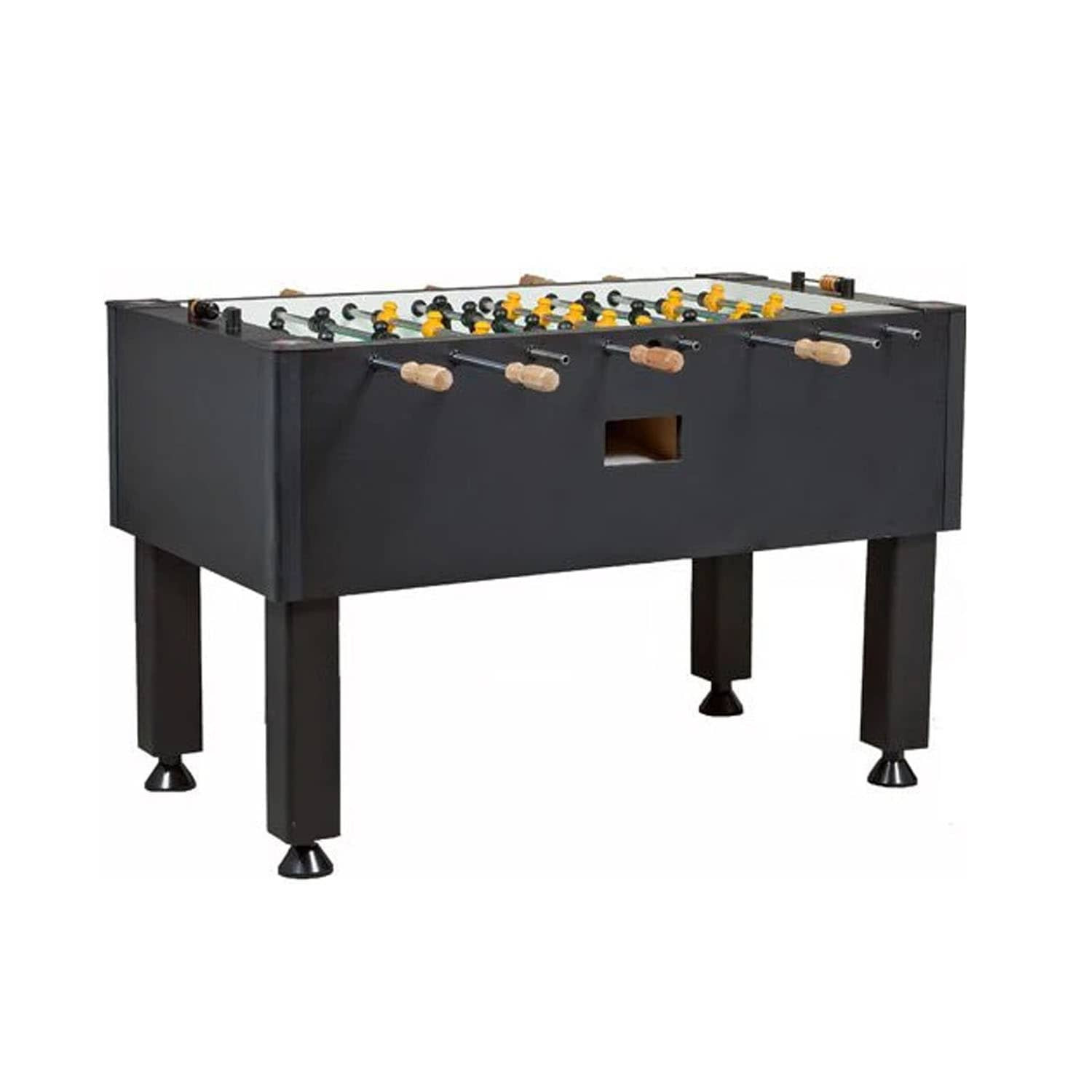 This 4FT indoor football soccer table is MDF wooden with color sticker pattern, strong steel rods with slide bearings for smooth rotation and ball serve cups on both sides for convenience.