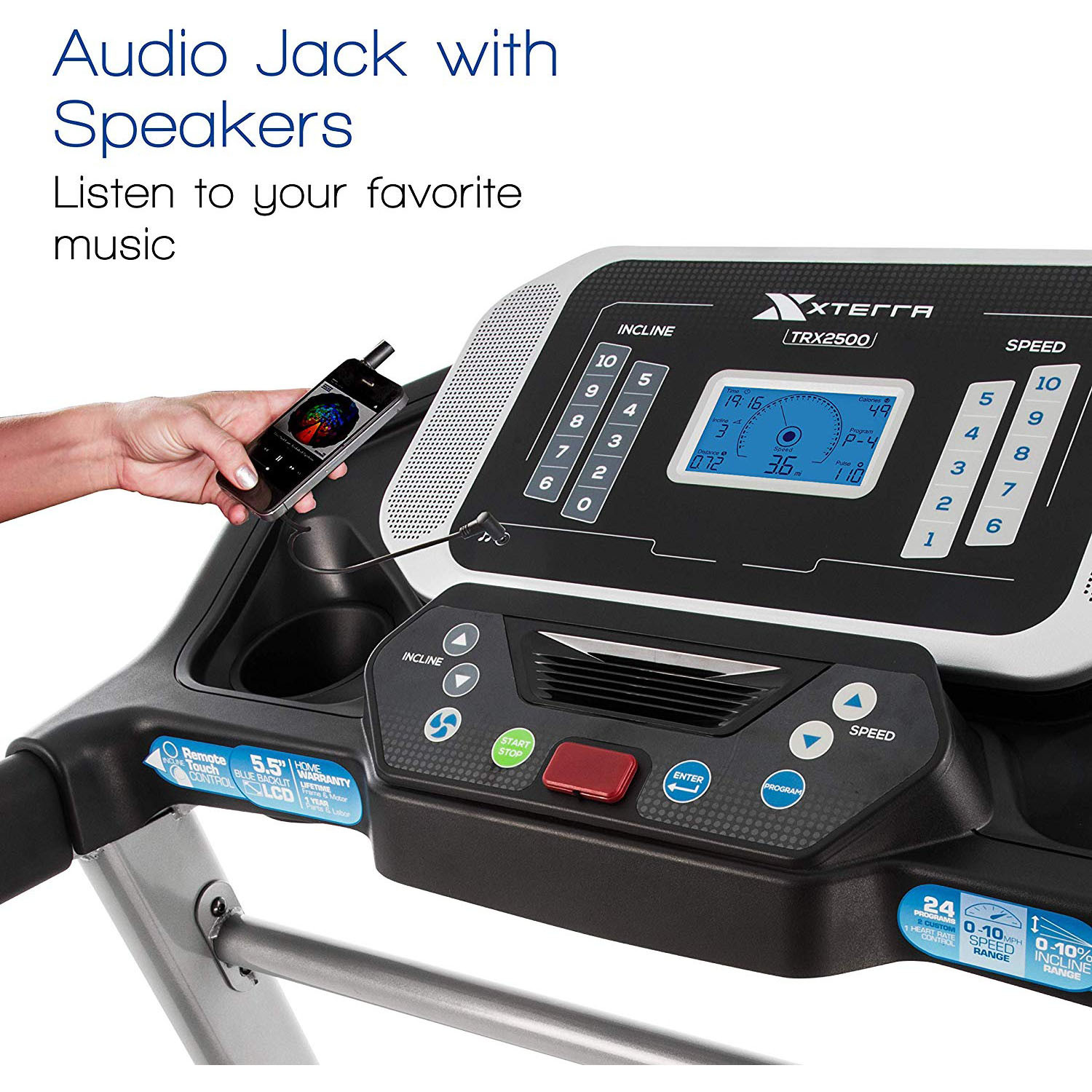 Start down the road to the best shape of your life with the XTERRA Fitness TRX2500 treadmill. The console display features an easy to read large 5.5” Blue Backlit LCD display with 24 preset programs for users of all fitness levels. Other convenient features include the direct access speed and incline buttons for quick workout changes, convenient handlebar controls for both speed and incline, speakers for your favorite tunes, and a cooling fan to keep you cool.