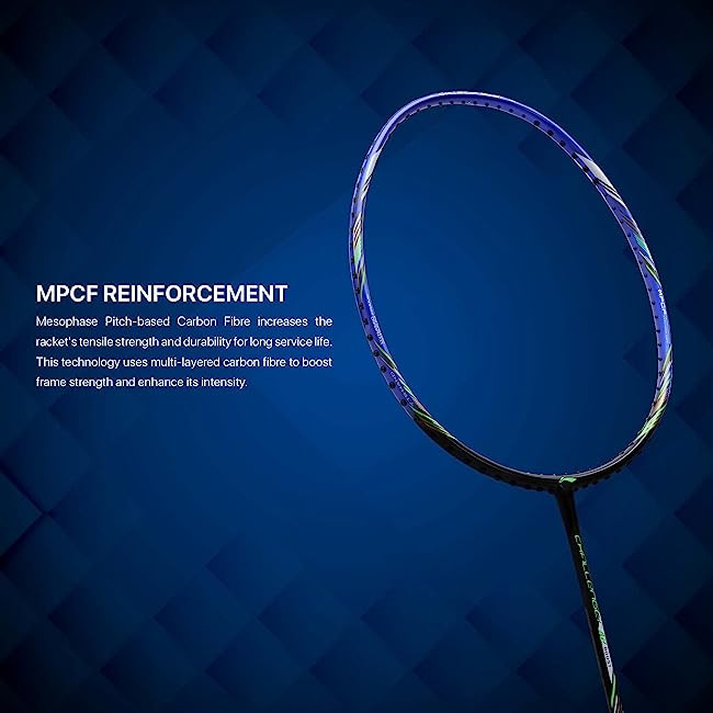 • MPCF Reinforcement - The use of multi-layered Mesophase pitch-based Carbon Fibre increases the racket's tensile strength and durability.