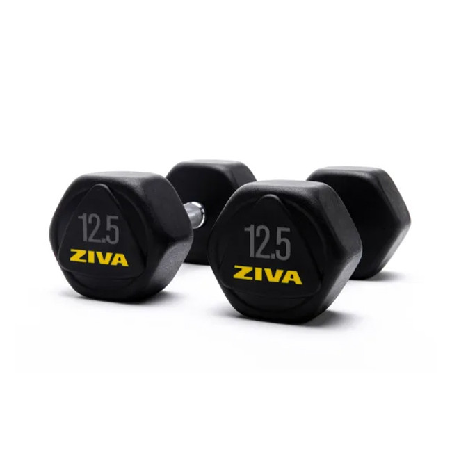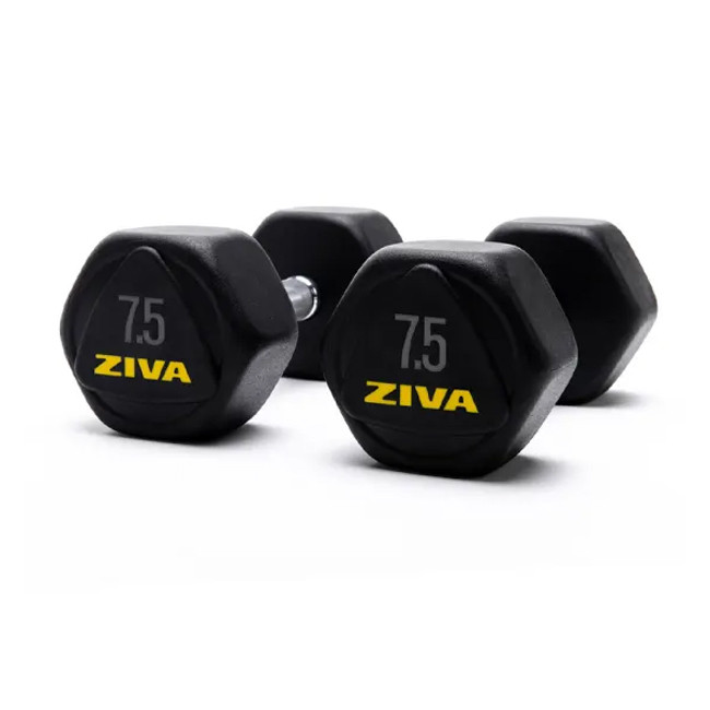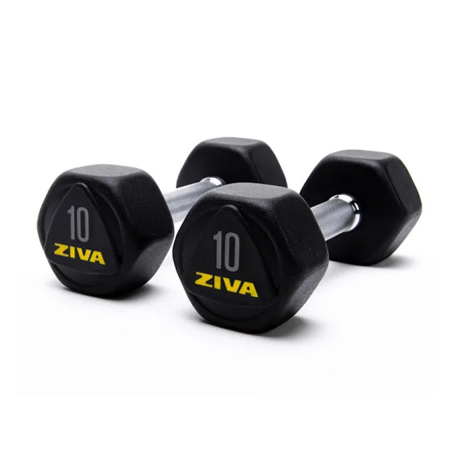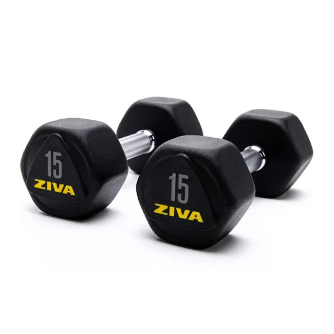 Ziva Performance Steel Hexagon Dumbbells - These dumbbells are an absolute necessity for your strength workouts because they have an anti-roll hex head with rounded edges, two color etched text, and a premium odourless urethane finish. A corrosion-resistant knurled chrome grip for extended use is featured on the one-piece design with an unbreakable solid steel core.